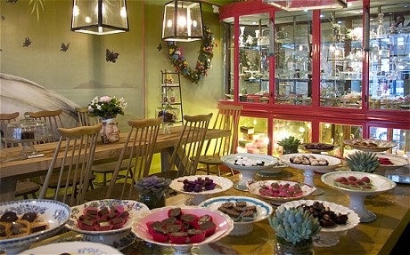 Above a marble counter, exposed bulb lanterns illuminate plates and cake stands laden with treats. When I say illuminate, I really mean it, as Cocomaya have an abundance of literally dazzling chocolate from multicoloured glittering letters to shimmering novelty chocolate flowers and rats – sounds weird but these are truly impressive.